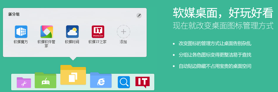 2、媒体桌面好玩好看:现在就改变桌面图标管理方式,分组让各色图标变得更整洁且易于查找。自动贴边隐藏不占用宝贵的桌面空间。
