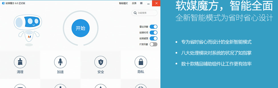 “智能模式”倾向于一键化,主界面上有常用的八个功能图标、四个功能开关和一个“开始按钮”,非常简洁。轻点“开始”按钮,软媒魔方便自动查找系统垃圾、无用开机启动项、安全隐患、软件更新情况,再点击“处理”按钮,所有问题就会被自动处理,简单有效,比较适合初级用户和追求快捷的用户。