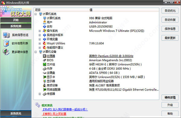 Windows优化大师深入系统底层,分析用户电脑,提供详细准确的硬件、软件信息,并根据检测结果向用户提供系统性能进一步提高的建议。