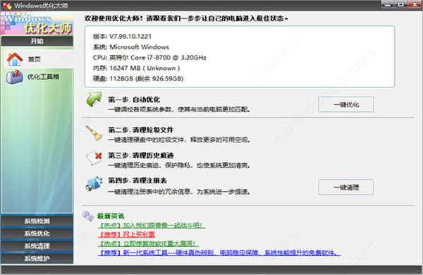 Windows Optimization Master是一款功能强大的系统工具软件,提供系统检测、优化、清洁和维护模块,使用Windows优化大师可以有效地帮助用户了解他们的计算机软硬件信息,为用户提供最准确、最详细的硬件和软件信息,并有针对性地进行优化,让你的电脑运行速度更快,焕然一新。喜欢的朋友赶紧来下载吧!