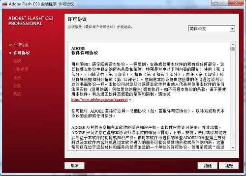 2、在安装前需要关闭相关的软件,例如photoshop、firefox等,这时会出现安装画面,点击“接受”按钮3、接下来再点击下一步按钮,在选择需要安装的路径,一般选择数据盘