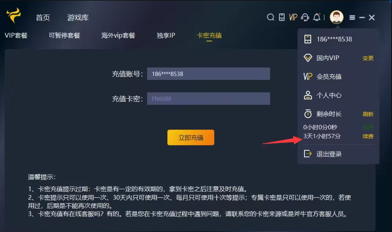 第三步:等待片刻,如果充值成功,您可以进入个人中心查看时长信息,确认是否已经到账。