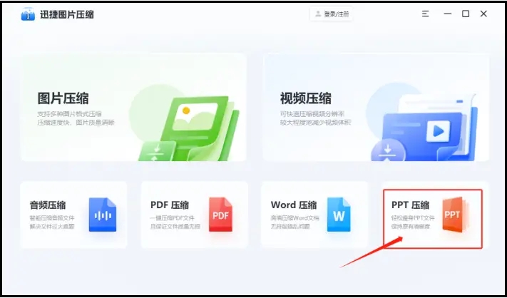 这是一款专门针对图片、视频进行压缩的软件,集视频压缩、图片压缩、PDF压缩、PPT压缩以及Word文档压缩于一体的神器!轻松解决文件过大无法压缩的难题~工具打开,在主界面选择“PPT压缩”按钮。