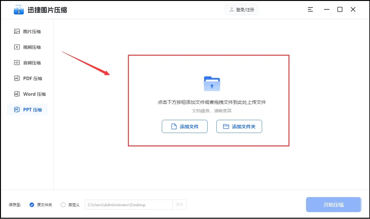 进入PPT压缩的主操作页面后,便可将文件拖到中间的文件导入区,这里可以一键选中多个文件,批量拖拽上传。