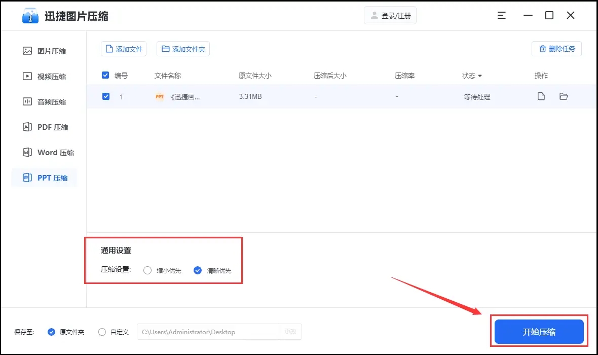 文件导入后,可在下方设置好压缩等级,这里有“缩小压缩”和“清晰优先”两种模式任意选择。最后点击“开始压缩”按钮,系统就会自动压缩了