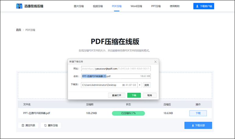 完成以上设置后,点击“开始压缩”按钮,迅捷压缩在线软件将开始对PDF文件进行压缩。压缩完成后,我们可以看到压缩后的PDF文件大小和清晰度都有了明显的改善。此时,我们可以选择直接下载压缩后的PDF文件或者将其保存到自己的电脑中。