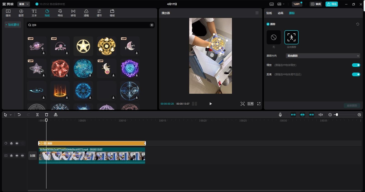 在视频预览窗口下方,选择“特效”或“贴纸”选项。