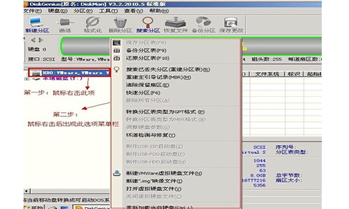 3、鼠标放在所要分区的硬盘上面,鼠标右击会出现下面的选择菜单;