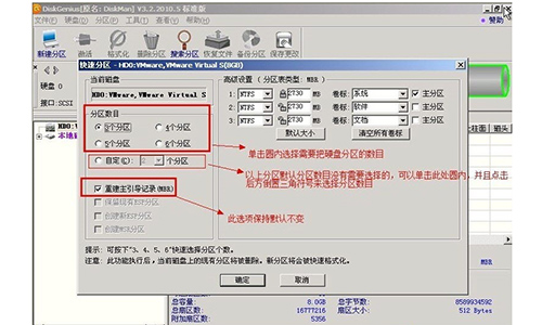5、选择所需要分区的数目或手动选择硬盘分区数目,并“重建引导记录”保持不变;