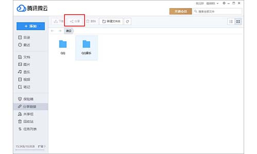 1、如果您想把某一个文件分享给好友,可以先进入微云网盘,点击页面上方的“分享”,选择要分享的文件。