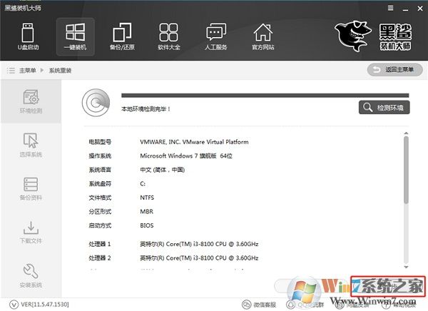 一、一键装机1、下载安装后打开黑鲨装机大师,点击上方一键装机,选择系统重装,软件会进入环境检测环节,检测结束后点击下一步,会推荐符合当前电脑安装的系统。