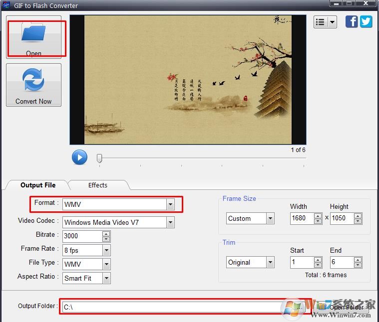 2、打开之后,点击OPEN 选择一张GIF图片,然后在 format 选择你要转换的视频格式,输出目录 也选择一下。