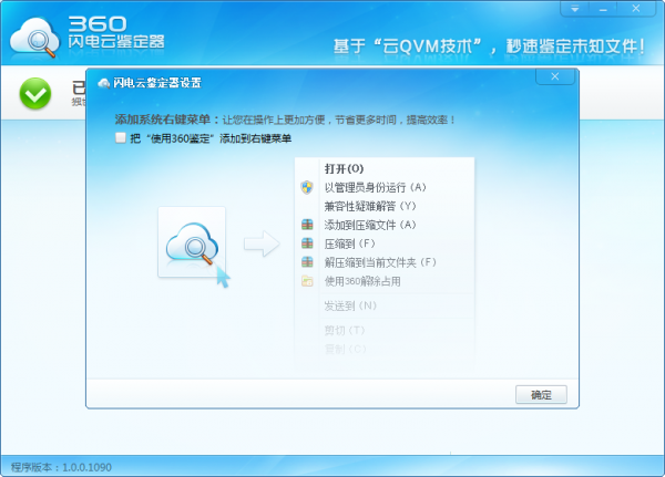 还可选择将360闪电云鉴定器集成到 Windows 右键菜单中,随时可以鉴定文件。