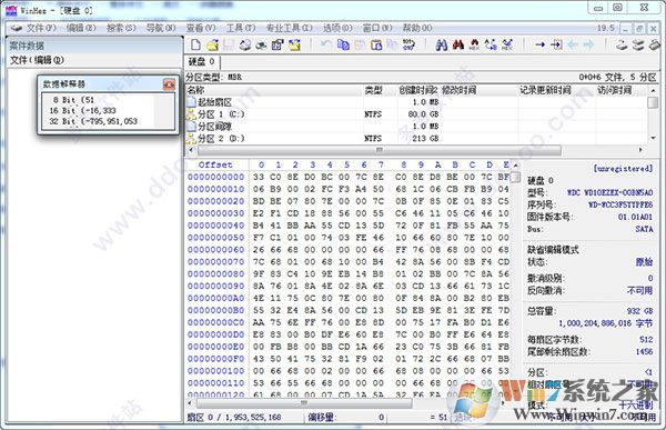 3、这里我们选择整个磁盘,再点确定,然后我们就看到了Winhex的整个工作界面,如下图: