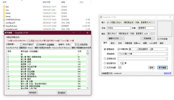 EasyPub是一款功能强大的TXT转EPUB转换器,可以将txt文本转换成epub或是mobi,也可以将epub转换成txt或者mobi。使用非常简单,章节、版式、字体、书籍信息、css样式、插图可以很方便的制作和转换epub或mobi电子阅读书籍。载入TXT文件后,只需设置书名、作者、封面以及输出目录,即可快速进行转换,您也可以根据需要对章节、版式、字体、书籍信息、定制css、插图等参数进行调整,以获得最佳的输出结果。