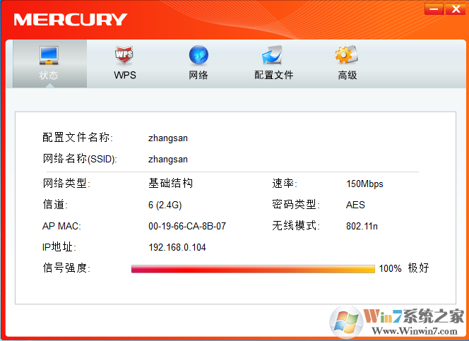 成功连接之后,点击 状态 ,可以看到无线信号基本信息以及获取的IP地址。