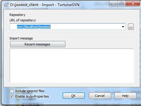 4.测试。任意右键点击一个之前做的项目,这里我选择了一个名为jwstest_client的项目,在弹出的上下文菜单中选择tortoiseSVN->Import,出现如下界面: