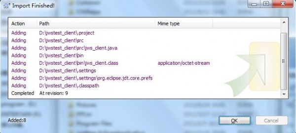 需要注意,在这里,我上传的是jwstest_client目录,但是jwstest_client本身这个文件夹并没有上传,也就是说import的内容是jwstest_client里面的所有文件和目录。现在我们去SVN库中看一下上传的文件存放在什么地方了: