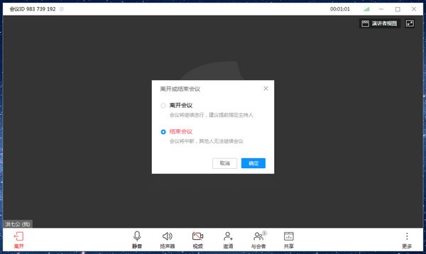 点击[会议视窗]中左下角【离开】按钮或右上角【X】按钮,在提示弹窗中点击【结束会议】即可结束会议;