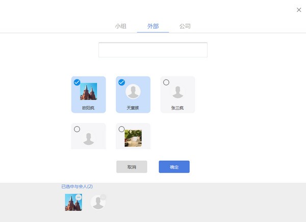第三步:点击[添加],勾选企业/外部/小组中的联系人,并点击[确认];