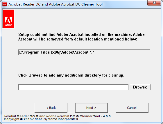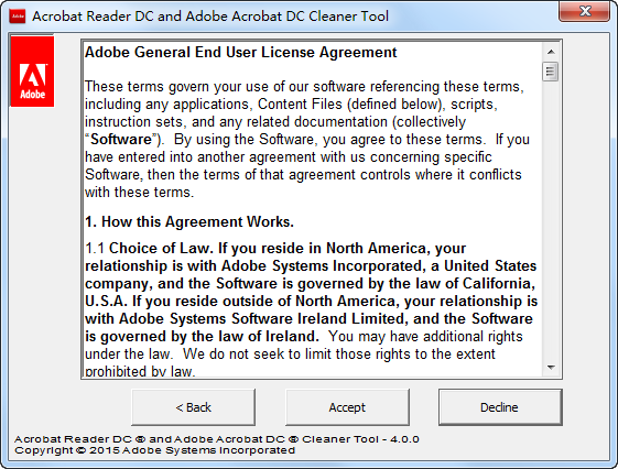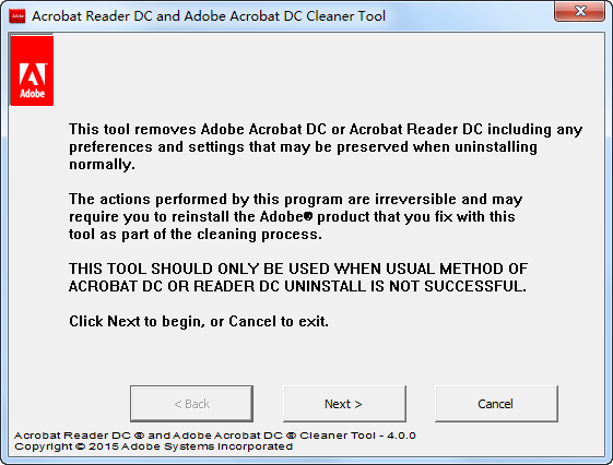 1.下载解压打开 AdobeAcroCleaner_DC2015.exe,启动 Adobe Reader and Acrobat Cleaner Tool 4.0.0,然后点击 Next 按钮: