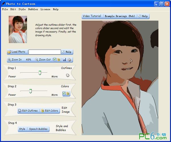加载照片后,你可以通过选择更平滑或更清晰的图像改变它。您还可以选择输出图像中更多或更少的细节。部分图像可以被选择以被合并或分割。如果你不快乐与原来的颜色,你可以使用一个调色板替换它们。如果你觉得你可以做的更多,你可以检查出的视频教程。你可以学习如何在几分钟的时间一个漂亮的卡通。输出将被保存为JPG格式,并可以在纸上直接从程序打印。