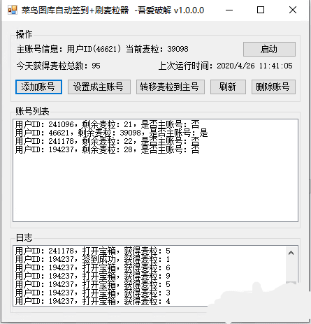 菜鸟图库自动签到+刷麦粒器是吾爱破解网友自主研发的一款用于自动在菜鸟图库签到的签到工具,还可以自动刷麦粒,可以同时刷多个账号,并支持将麦粒转移到主号,是一款非常不错的小工具!