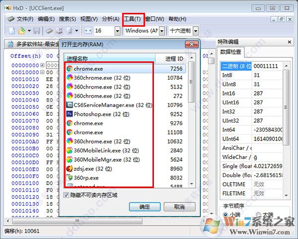 3、工具菜单--打开内存--可以对正在运行的程序进行编辑。比如用户可以对游戏进行修改,改装备,改血值,改金币等。