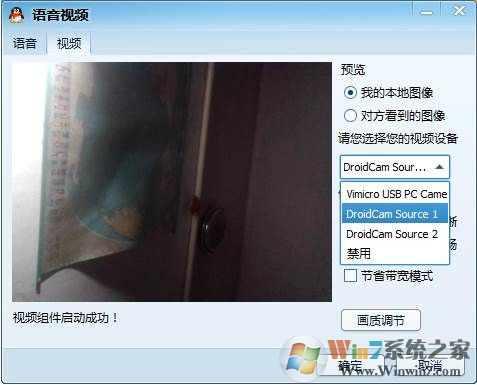 下面就来演示一下如何在QQ上使用手机摄制的画面。首先打开视频设置,在视频设备里面找到“DroidCam”选项并选择,这样就能让你的好友看到你手机拍摄的画面啦,而且连声音也能用手机实时传输哦!