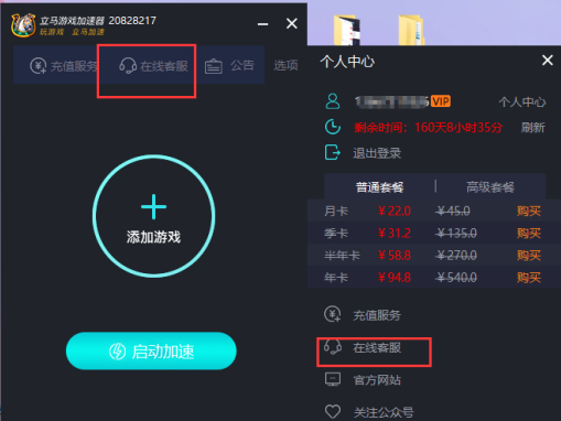 点击选项按钮,可以查看个人中心,剩余时间和套餐价格