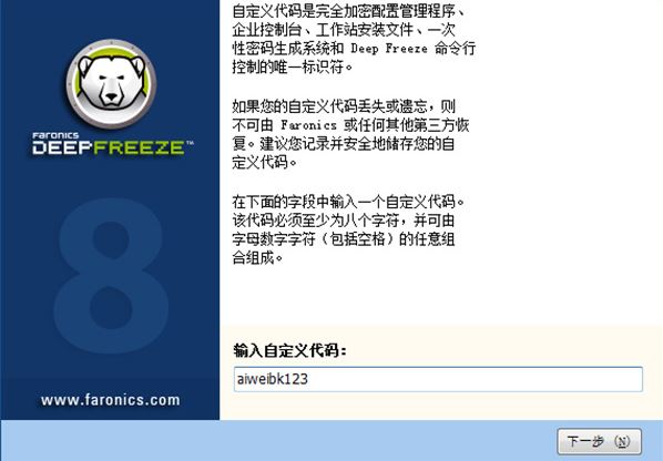 6、输入自定义代码“aiweibk123”,点击下一步;