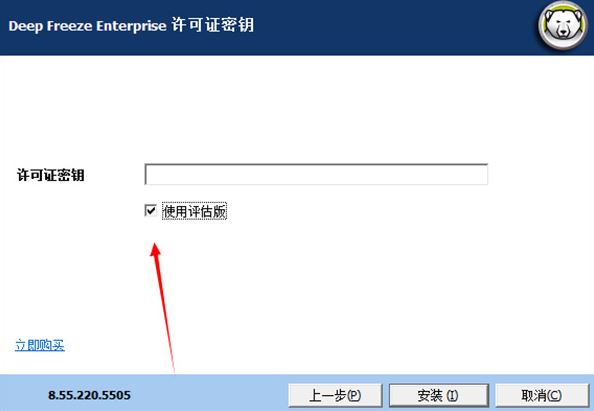 3、需要输入许可密钥,勾选使用评估版,点击安装;