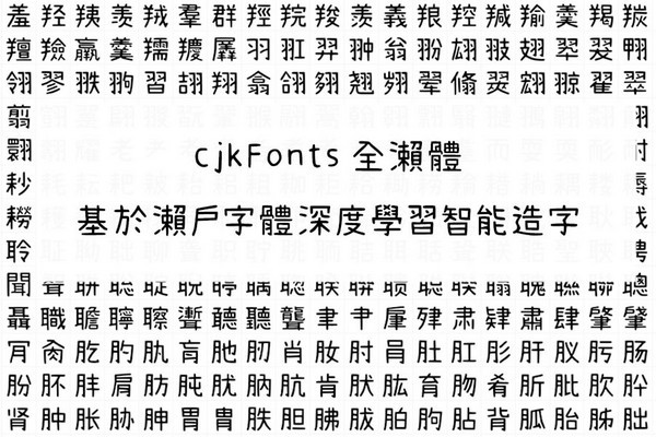 cjkFonts全濑体是一款基于濑户字体深度学习智能AI造字而产生的字体,字体的风格会跟濑户字体有轻微的分别,全面支持繁简日韩字体,弥补了濑户字体没有的繁体及简体字。