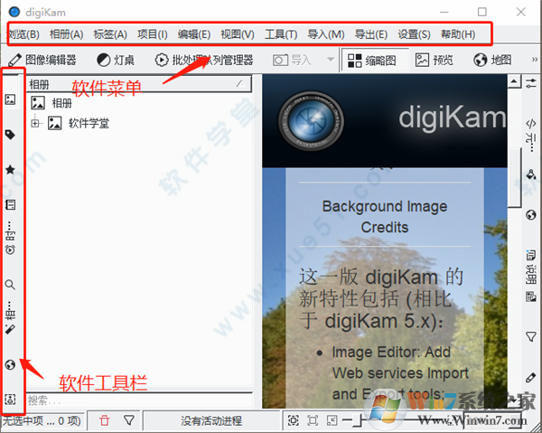 4、digikam打开,上方为软件菜单,左边是编辑照片的工具栏。可以选择自己需要的工具进行编辑