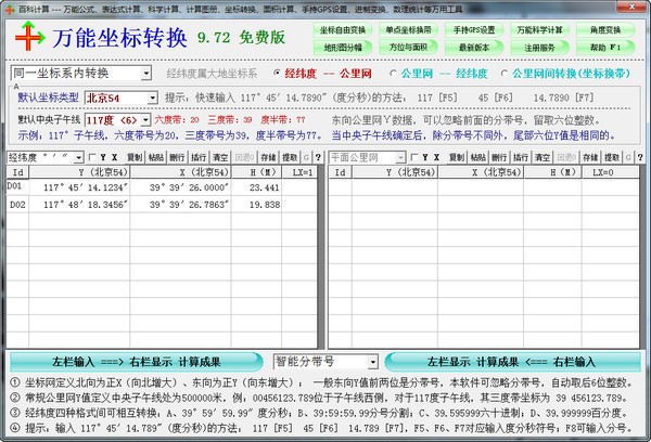 万能坐标转换器是winwin7下载给大家分享介绍的一款具有人性化、高精度、多功能的坐标转换工具。是一款适用于测量人员、地质人员、科考人员、工程技术人员等,对地图知识及坐标知识的学习与工作应用的好帮手。这款坐标转换工具除了可以进行转换坐标之外,还具备了:数值计算、表达式计算、复杂的公式计算、角度变换、进制换算等实用功能,可满足学生、办公人员、测绘人员、科技工作者等日常学习工作需求。有用到的用户欢迎前来下载!