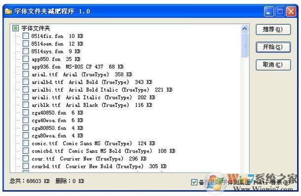 程序默认或点击“推荐”按钮,会保留系统和一些常用软件、游戏必要的字体。准备好后按“开始”进行减肥。