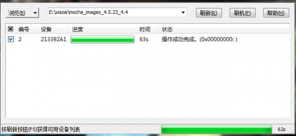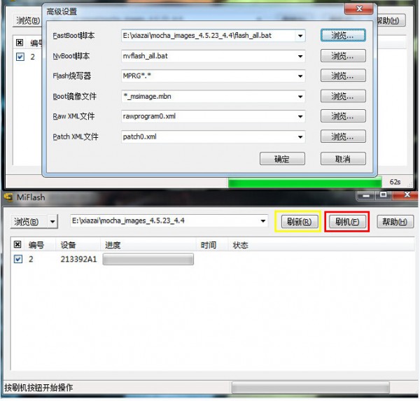 点击黄色圈选部分刷新,刷机程序会自动识别手机,点击浏览旁的向下箭头,选择高级设置——选择fastboot刷机脚本为ROM路径中flash_all.bat,点击红色圈选部分刷机开始刷机。