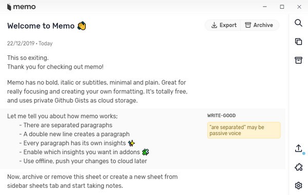 Memo云笔记软件是一款支持支持文字、图片、链接等数据云存储笔记的软件,该软件支持自动格式化,支持同步到云端,可以将这些数据自动保存在Github的gists中然后你可以随时进行查阅。使用简单,界面舒适,功能强大的一款云笔记工具,有需要的用户快来获取吧~