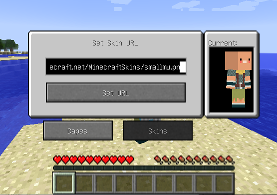 要穿上披风,只需按下分配好的功能键(默认是C键),会弹出一个窗口,将披风的图片网址放到对应的输入框,点击Set URL,就穿上啦!