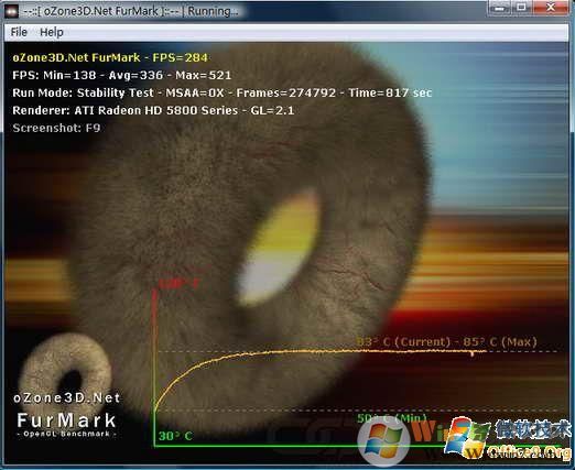 在测试的过程中,会出现一个测试的窗口,上面还要显示显卡的温度曲线,以便精确了解当前的显卡状况。只要没有人为干预,该测试会一直进行下去。笔者建议显卡超频之后,运行此测试10分钟以上,在此过程中不出现花屏、死机等异常状况,才表明显卡超频成功。否则的话适当降低显卡的频率,直到通过10分钟的稳定性检验为止。