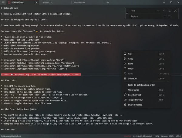 在我决定自己制作现代Windows10记事本应用程序之前,我等了足够长的时间。不要误解我的意思,Notepad++,VSCode和Sublime都是很棒的文字编辑器。我都用过,以后还会继续用但是,要么太重,要么看起来不太吸引人。有时候,我只是想在Windows上写笔记或编辑文件等。因此,我决定在这里制作win32记事本的替代品,试着给予现代的外观和感觉。最重要的是,它必须让人眼花缭乱,吸引每个人。