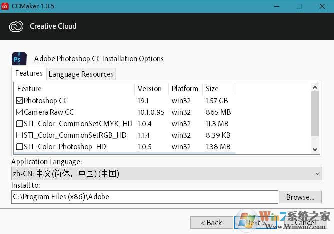 2、在CCMaker工具内选择下载的产品,还可选其它可用组件和多国语言资源。