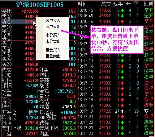 3.速率:期货交易雷电下单,比一般下单快10秒;非常委托界面,多方面减少5秒;即时五档行情,专线运输传送;每分100笔之上的交易量清单。