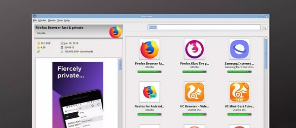 2、在登录账号之后,就可以从 Raccoon 里搜索你想要的应用,然后下载。还能配合 ADB 程序直接将下载的应用安装到手机上。