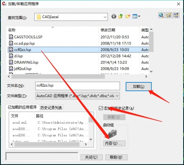 下载好插件后,在CAD里输入appload命令,即会弹出加载框,找到cc和zz文件,按下图所示操作点击加载,拖入启动组,点击关闭就可以了,接下来是尽情使用了。