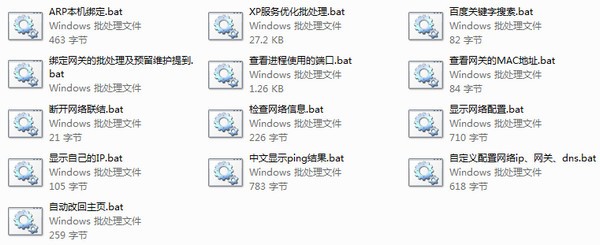 本文中winwin7为大家介绍这个打包的批处理文件内含50几个常用的批处理文件,主要分成了三大类:网络类、系统类和其他类,有ARP绑定、自定义网关、端口进程、硬件信息、搜索文件、注册表锁定...都是非常常用的批处理文件,欢迎大家前来下载。