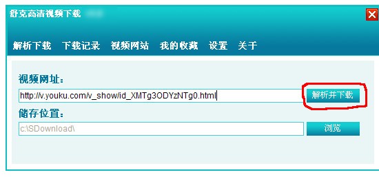 第二步:将浏览器地址栏中的视频播放地址复制粘贴到软件中,然后点击旁边的"解析并下载"按扭即可轻松开始下载。