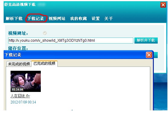 第三步:下载完后,点击软件的"下载记录"按扭,就可以看到刚下载完成的视频,并且可以利用自带的播放器播放视频。