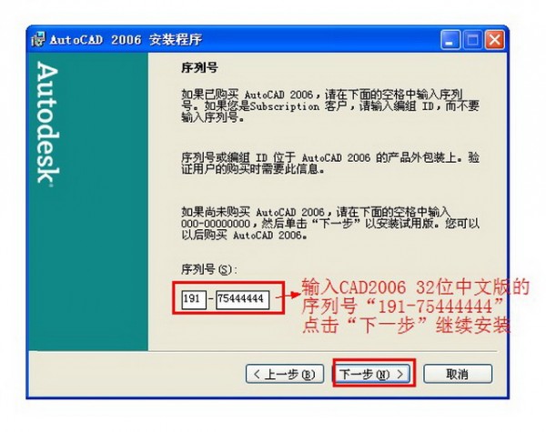 5、序列号的输入CAD2006 32位中文版的序列号“191-75444444” 输入正确后点击“下一步”继续操作