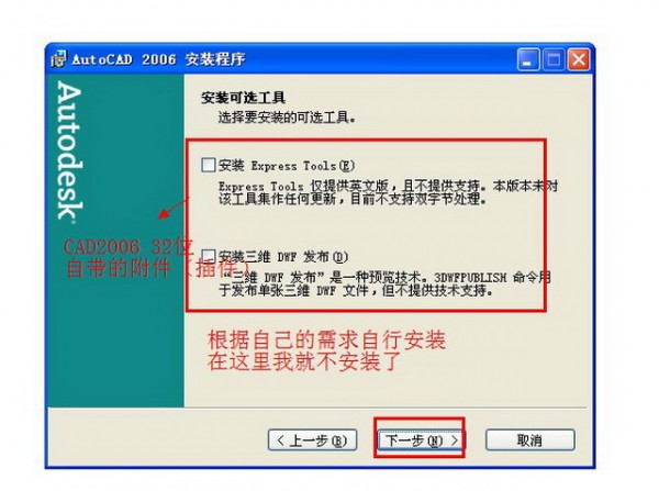 8、CAD2006 32位中文版的插件(附件)的安装根据自己的需求选择安装 确定后点击“下一步”继续操作
